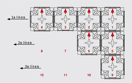 La instalación de MODULO se realiza colocando los casetones de la derecha hacia la izquierda y de arriba hacia abajo, manteniendo siempre la flecha imprimida en la cúpula hacia arriba.