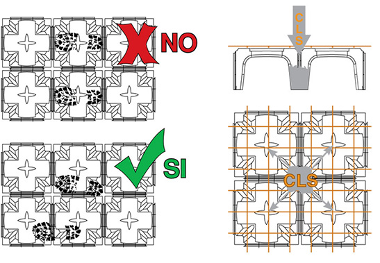 Para ensamblar correctamente los elementos MULTIMODULO es suficiente superponer verticalmente el enganche de sección en “U” macho y hembra del casetón.