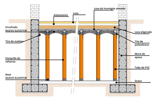 El sistema NUEVO ELEVETOR de Geoplast S.p.A. se utiliza para crear un forjado sanitario ventilado sobre pilares de soporte comprensivo de losa superior de hormigón armado colocando sobre la capa de base los elementos modulares en polipropileno regenerado mutuamente conectados. Este sistema será compuesto por una rejilla de base con cuatro barras 58×58, altura 2,5 cm, de tubos en PVC de forma variable y diámetro de 125 mm y encofrados de base cuadrada 58×58 cm, altura 15 cm, con forma de cúpula rebajada con por lo menos cuatro indicadores de referencia para el hormigonado y la corecta colocación de la red electrosoldada para evitar hundimientos de la estructura en proximidad del pie de apoyo del casetón. Los elementos mutuamente conectados son adecuados para ser hormigonados (clase de resistencia mínima de RcK 250) y forman pequeños pilares con intereje cuadrado en las dos direcciones. La crujía sanitaria realizada se puede usar para instalar tuberías o instalaciones eléctricas y para la ventilación de la fundación.