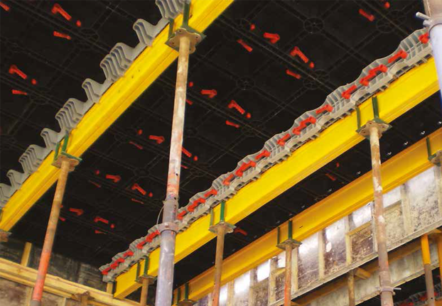 El sistema está compuesto por paneles GEOPANEL 120×60 cm (peso máximo 11kg) y tres viguetas en plástico que tienen que ser colocados sobre las vigas tradicionales de madera H20 que permiten el desencofrado anticipado.