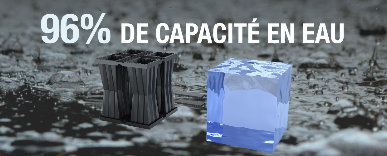 • Aquabox transforme 100 % du volume brut en 96 % de stockage net d’eau.