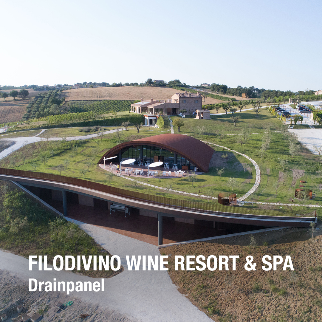 Conçu par l’architecte Cristiana dell’Acqua du Studio dell’Acqua, le complexe Filodivino a été intégré au terrain en s’harmonisant avec le paysage en pente. Pour ce projet, Drainroof a été utilisé pour créer un toit vert qui s’intègre parfaitement aux collines et aux vignobles environnants, améliorant ainsi l’efficacité énergétique du bâtiment.