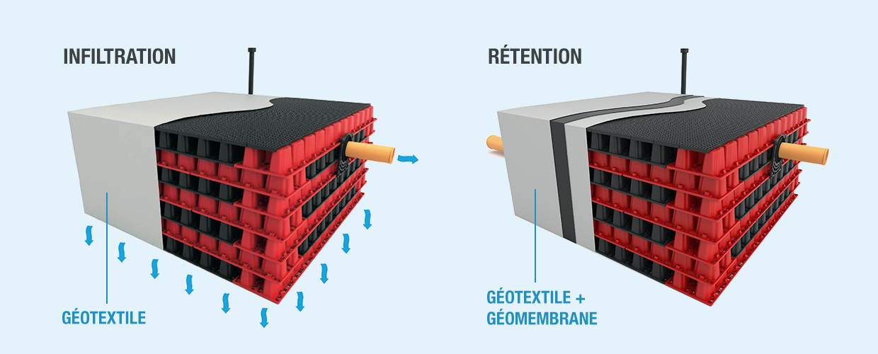 Contrairement au gravier, Drainpanel est conçu pour le multitâche. Il peut être utilisé à la fois pour l’infiltration et la rétention des eaux pluviales en vue de leur réutilisation, selon le type de géotextile utilisé pour la couverture du bassin.
