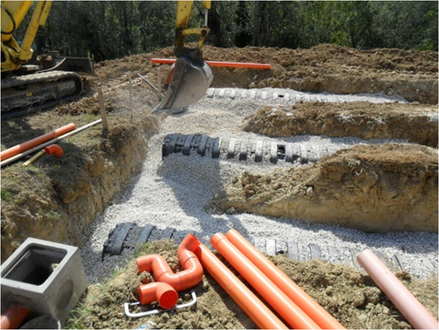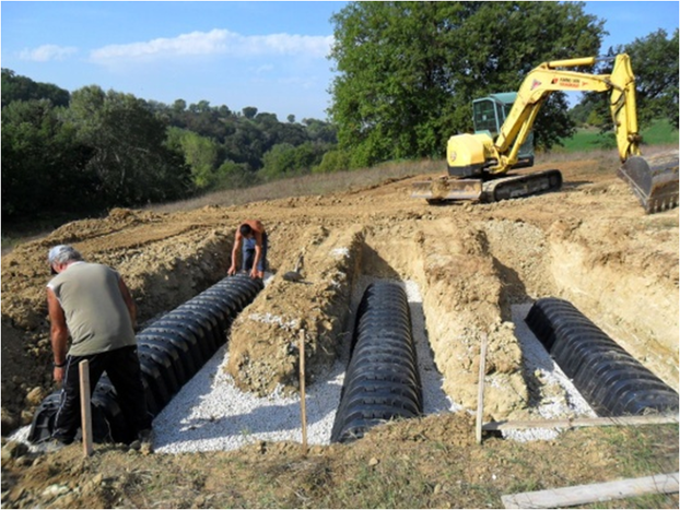DRENING peut être utilisé pour la réalisation de systèmes pour la sub-irrigation des eaux usées si on installe le produit en tranchées, en aval du réservoir pour le traitement biologique.