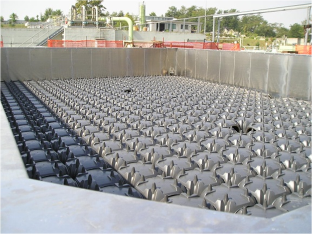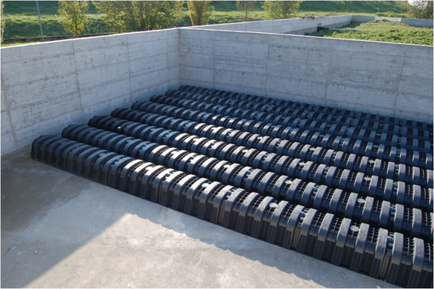 BIODRENING permet de réaliser le pavage d’un biofiltre avec une installation à sec du produit, en évitant de créer une dalle en béton. La grande résistance de l’élément permet qu’il ne s’affaisse pas sous le poids des couches supérieures. En outre, la grande surface laterale fissurée des chambres BIODRENING permet une bonne circulation de l’air à l’intérieur de la couche de filtre en assurant son répartition homogène. BIODRENING est un produit idéal pour les biofiltres de dimensions contenues, dans lequel l’utilisation de machines pour le remplacement de la matière de remplissage n’est pas nécessaire.