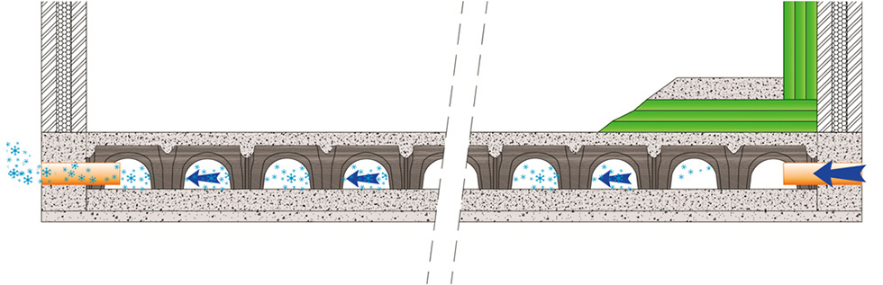 Les dommages causés par une chaussée glacée peut impliquer des graves problèmes structurels. La méthode de construction plus sûre et moins coûteuse pour éviter le soulèvement gélival est l’utilisation du système Modulo pour réaliser un espace ventilé entre le sol et la dernière couche de l’emballage imperméable de la cellule, afin d’éliminer complètement l’humidité.