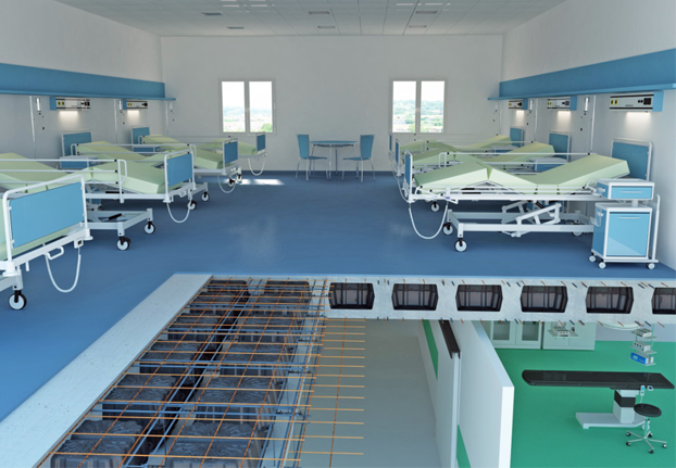 Dans la construction de planchers pour hôpitaux il faut prendre en compte:COMPORTEMENT SISMIQUE – RÉSISTANCE AU FEU – OPTIMISATION DE STRUCTURES VERTICALES (MURS ET PILIERS)La réalisation d’un plancher allégé bidirectionnel remplit tous les points énumérés ci-dessus. En effet, l’allégément permet de réduire le poids du plancher et, par conséquent, de diminuer la masse sismique de la structure solicitée en cas de tremblement de terre, assurant à la fois la sauvegarde des patients et le fonctionnement continu des salles d’opération.Le niveau de performance contre le feu est un autre aspect important, qui, en conformité aux réglementations REI, est à juste titre très coûteux pour ces bâtiments. Dans ce cas, un plancher à caissons allégé NOUVEAU NAUTILUS garantit le respect de ces demandes. En outre, le comportement bidirectionnel du plancher à dalles optimise le positionnement des piliers, créant ainsi de grands espaces sans piliers et murs, plus faciles à gérer.