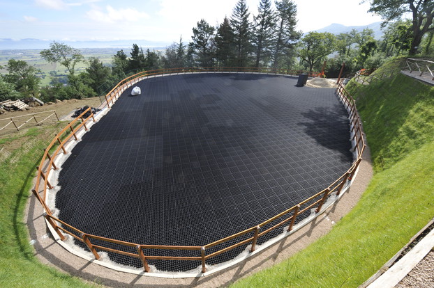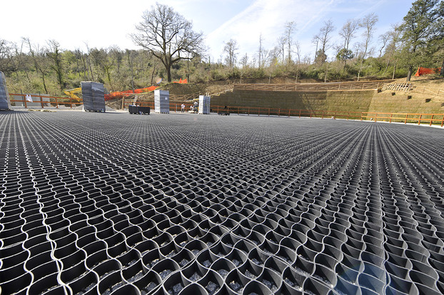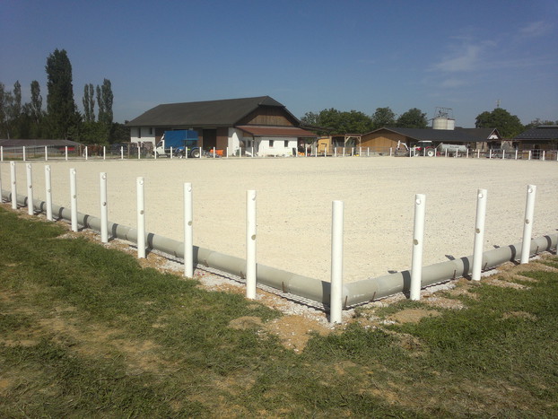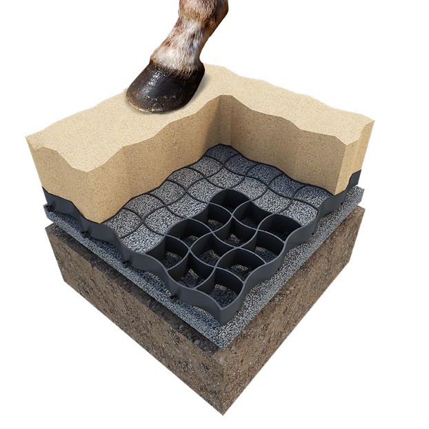 Pour créer des manèges et arènes d’equitation, il faut réaliser une stratigraphie avec une couche de drainage en gravier et une couche d’installation en gravillon ou sable. Puis on pose RUNFLOOR, que maintient toujour stable la surface grâce à son innovateur système d’accrochage. On remplisse les alvèoles de la dalle avec du gravier ou sable. Sur la dalle il faut réaliser une autre stratigraphie de 10-20 cm avec des sable techniques pour l’equitation.