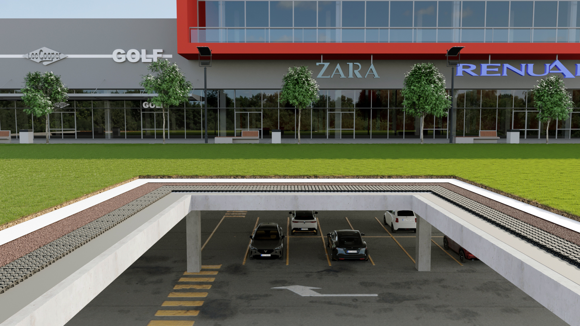 - Atténuation de l’îlot de chaleur urbain – les zones vertes réduisent la quantité de chaleur absorbée et émise par la structure du toit du parking, abaissant la température extérieure,