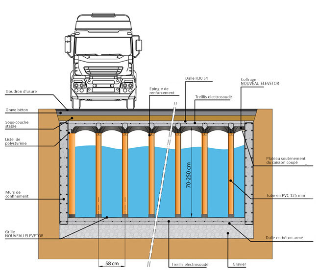 NOUVEAU ELEVETOR est un système innovant de dimension 58×58 h15 cm pour la réalisation de bassins à récupération d’eau favorisant un gain de main-d’oeuvre et de béton. Les consommations sont de 0,030 m/m au ras du caisson, sur lesquel on ajoute le remplissage des poteaux sur la base de 0,037 m/m par métre linéaire de hauteur.