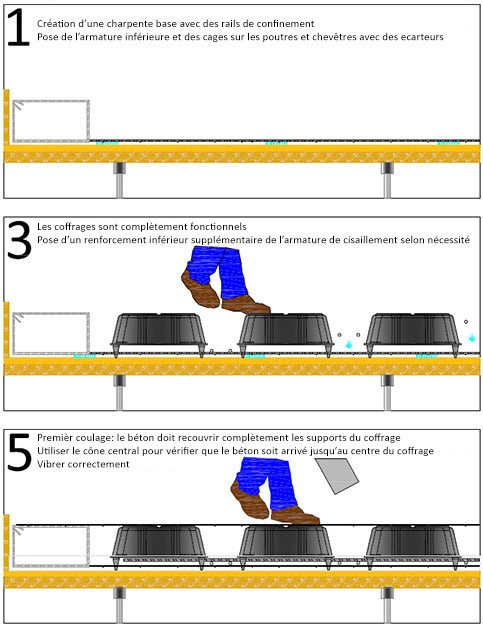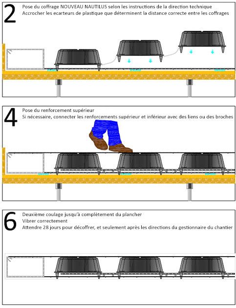 NOUVEAU NAUTILUS est facile à installer: il suffit de placer les modules sur le plan de coffrage alors que les distances et l’alignement sont assurés par l’utilisation des languettes d’écartement.
