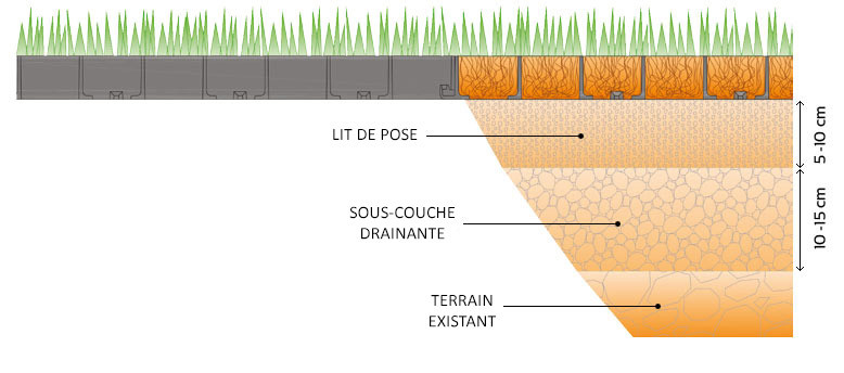 Non, parce que comme toutes les grilles traditionnelles, RUNFLOOR come tutte le griglie tradizionali, prévoit également l'inclusion dans une stratigraphie que permet la croissance du gazon pour couvrir complètement la surface. On a constaté que la couleur sombre de la grille se cache parfaitement à l'intérieur du sol.