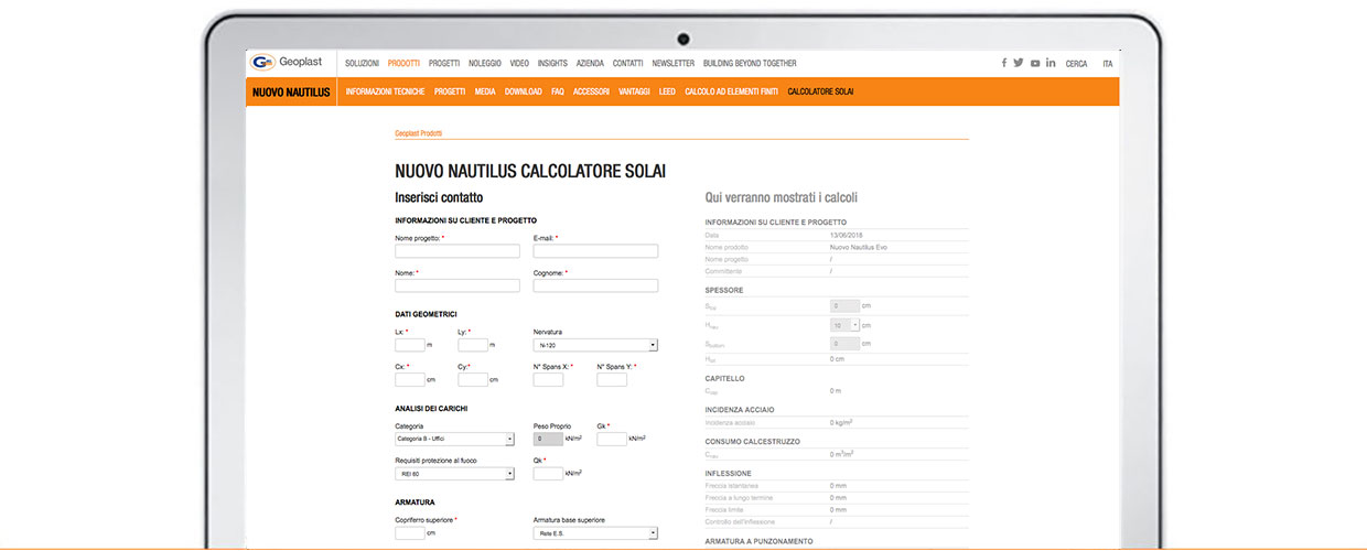 Il calcolatore è disponibile in inglese, italiano, francese, tedesco, spagnolo, portoghese e russo. E’ di grande utilità agli ingegneri che affrontano lo studio di piastre alleggerite con il sistema Nuovo Nautilus di Geoplast e fornisce un report di calcolo con tutti i dati di input e output, scaricabile anche in formato PDF. Un punto di partenza utile per successive analisi più approfondite.