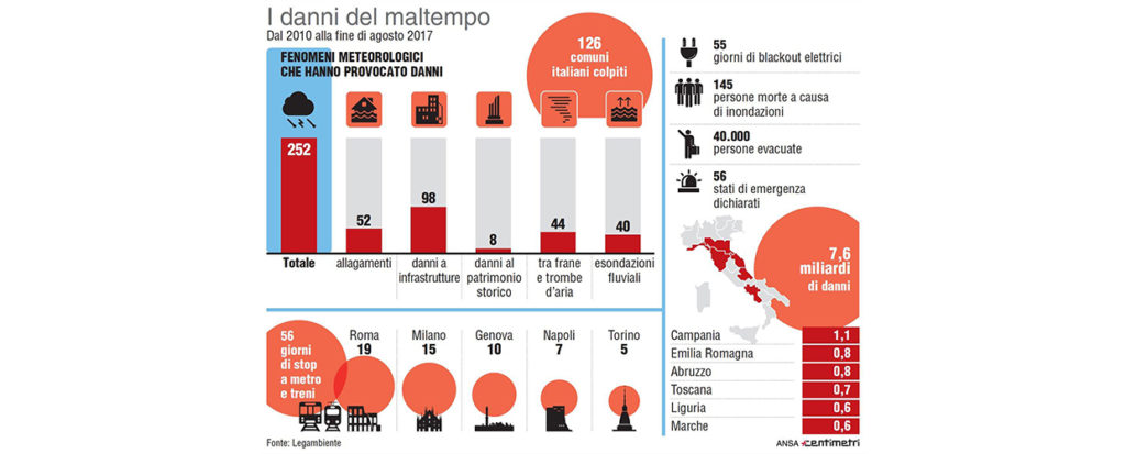 Un recente studio di Legambiente afferma che dal 2010 alla fine di agosto 2017 in Italia si sono registrati 252 eventi meteo catastrofici. Disastri che hanno causato la morte di oltre 145 persone e l’evacuazione di oltre 40.000. Un’ecatombe che ha un costo notevolissimo: tra il maggio 2013 e il dicembre 2016 per 56 casi di stato di emergenza sono stati accertati danni per circa 7,6 miliardi di euro per patrimonio pubblico, privato e attività produttive. Campania, Emilia Romagna, Abruzzo, Toscana, Liguria e Marche sono state le zone più colpite.