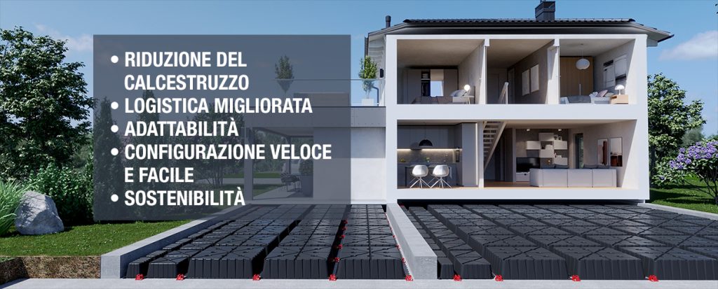 Realizzato con moduli grandi 109 x 109 x h30 cm. Geopod è progettato per creare nervature in calcestruzzo distanziate di 120 cm, rispettando la dimensione massima consentita dalla norma AS 2870-2011 per le lastre e fondazioni a terra.