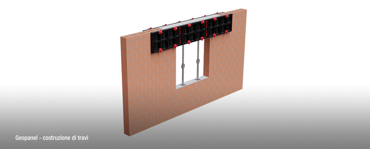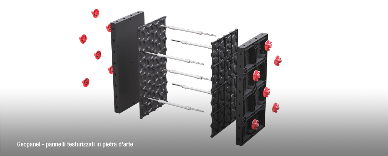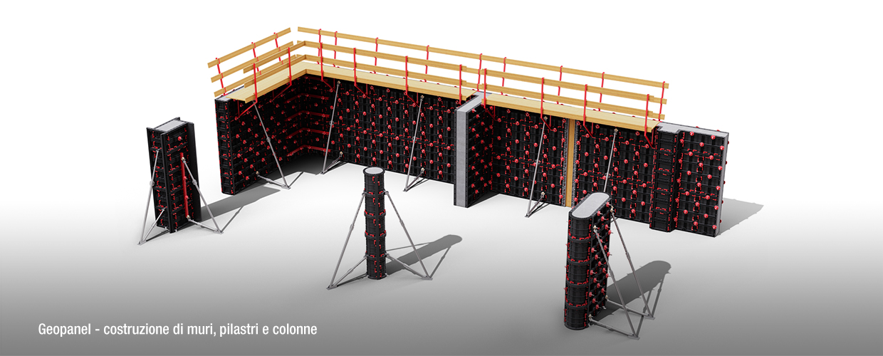 Geopanel è la nostra cassaforma in plastica riutilizzabile per la costruzione di muri in calcestruzzo. La sua semplicità e la gamma di dimensioni disponibili lo hanno reso conveniente per il getto di qualsiasi superficie piana in calcestruzzo e la cassaforma ideale per gli spazi inaccessibili. Dove la sua versatilità emerge in modo particolare, tuttavia, è in combinazione con altre delle nostre soluzioni. Grazie al set di accessori condivisi, Geopanel può essere integrato con gli altri nostri prodotti per casseforme e utilizzato nella costruzione di praticamente qualsiasi elemento strutturale: pilastri rettangolari, ellittici e di grandi dimensioni, travi di fondazione, impalcati di sostegno delle lastre, e persino soluzioni estetiche come i pannelli con texture in pietra d’arte.