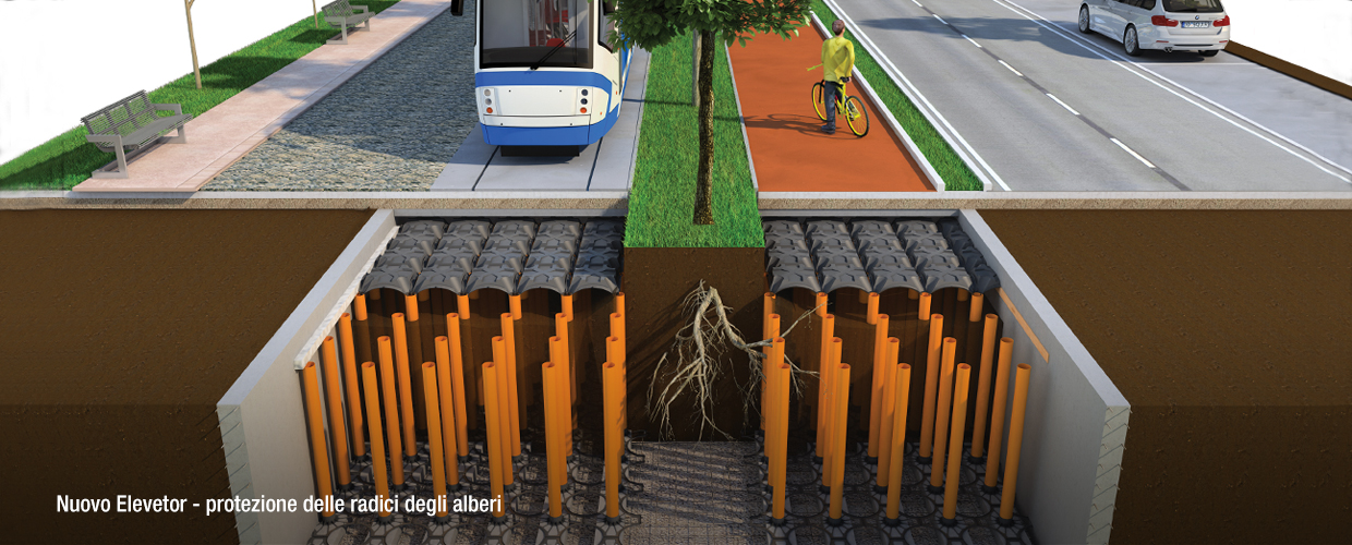 Nuovo Elevetor è una delle nostre soluzioni di fondazione progettate per il riempimento di solette a livello del suolo e poiché forma simultaneamente spazi vuoti, può essere utilizzato per una varietà di altri scopi, come la ventilazione delle solette, l’isolamento o l’installazione di sistemi MEP. Questa stessa qualità gli permette di essere applicato in progetti che non rientrano usualmente in questa gamma di prodotti, come la protezione delle radici degli alberi e la prevenzione delle inondazioni. Quest’ultima soluzione ha anche dato il via allo sviluppo di Nuovo Elevetor Tank, il nostro prodotto per l’acqua adatto alla costruzione di vasche in cemento per la gestione delle acque piovane.