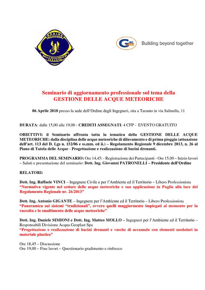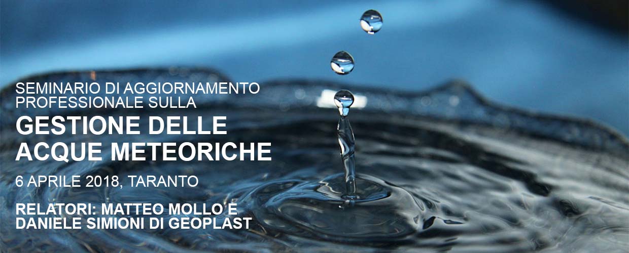 Venerdi 6 Aprile 2018, a Taranto, si terrà un seminario di aggiornamento professionale sul tema della Gestione delle Acque Meteoriche.