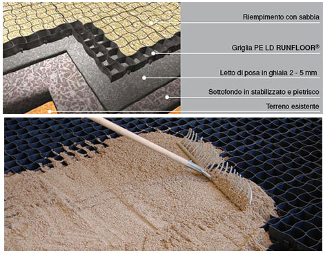 4) Posa di RUNFLOOR;5) Riempimento a raso delle celle con sabbie specifiche per l’equitazione o con ghiaino (granulometria 2-5 mm);