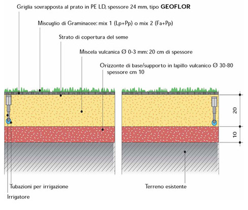Si consiglia di attendere il completo inerbimento della griglia e almeno due sfalci d’erba prima di utilizzare l’area. Si raccomanda inoltre di effettuare, periodicamente, la manutenzione del manto erboso, con corretta concimazione e la verifica del funzionamento dell’impianto di irrigazione.