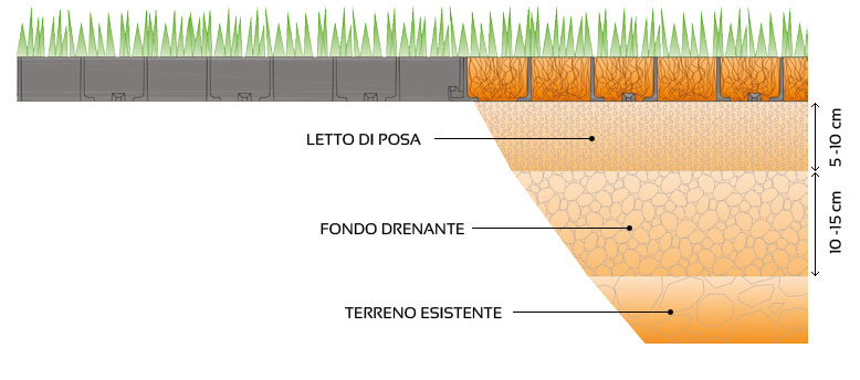 Letto di posa con 5-10 cm di miscela di sabbie vulcaniche arricchita con terriccio e concimi organici (granulometria 0-5 mm) stesa e ben battuta per avere un perfetto livellamento
