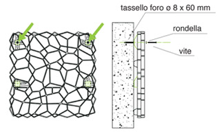 Installare le griglie Wall-Y dal basso verso l’alto e da destra verso sinistra, fissandole via via al muro (tasselli a pressione Ø8 x 60 mm.)