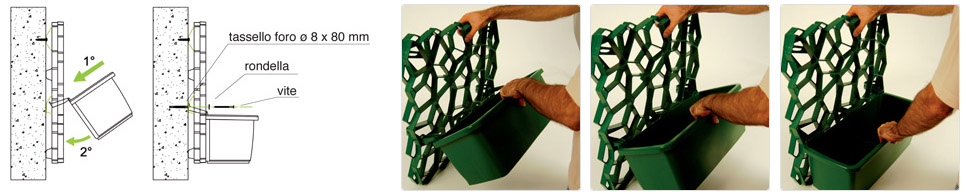 Il sistema è molto leggero, modulare e facile da installare. Il materiale plastico con il quale è realizzato è resistente all’umidità e ai microrganismi, e garantisce una maggiore longevità del sistema. La griglia è fissata permanentemente alla parete da ricoprire con vegetazione rampicante per mezzo di tasselli a pressione. Appositi fori nei piedini sono utilizzati per il passaggio dei tasselli.