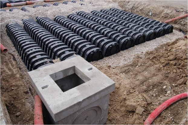DRENING è una soluzione ottimale per gestire le acque “in situ”, specie se vi è assenza di rete fognaria. Il sistema è in grado di raccogliere i diversi flussi, anche post-trattamento chimico-fisico, e di provvedere ad un efficace smaltimento delle acque negli strati superficiali del sottosuolo. La sua elevata resistenza ai carichi permette di installare il prodotto anche al di sotto delle aree di manovra, con delle profondità di scavo modeste per la posa. La possibilità di installare dei camini di ventilazione nel sistema consente di incentivare la depurazione biologica dei reflui, prevenendo odori molesti e restituendo un’acqua più pulita nell’ambiente.