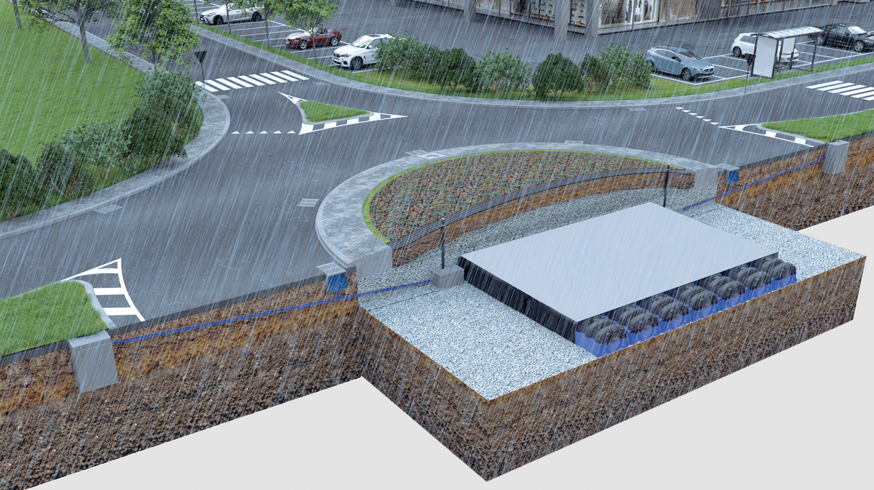 I prodotti Geoplast Drainroof e Drening in combinazione con la vegetazione a sedum, forniscono una soluzione sostenibile ed economica per la progettazione di una rotonda urbana. Geocycle è costituito da tre strati principali. Nella parte superiore si trova lo strato di vegetazione a sedum, che garantisce una manutenzione agevole delle piantine e richiede una nutrizione minima. Lo strato intermedio è costituito dai pannelli Drainroof che fungono da drenaggio e accumulo dell’acqua piovana. Forniscono sempre un completo apporto idrico alla vegetazione sovrastante evitando il ruscellamento superficiale. Lo strato inferiore della rotonda invece, è costituito dai moduli Drening, che formano un bacino di dispersione e di accumulo ad alta capacità, permettendo di immagazzinare l’acqua piovana e di riutilizzarla nei momenti di bisogno.